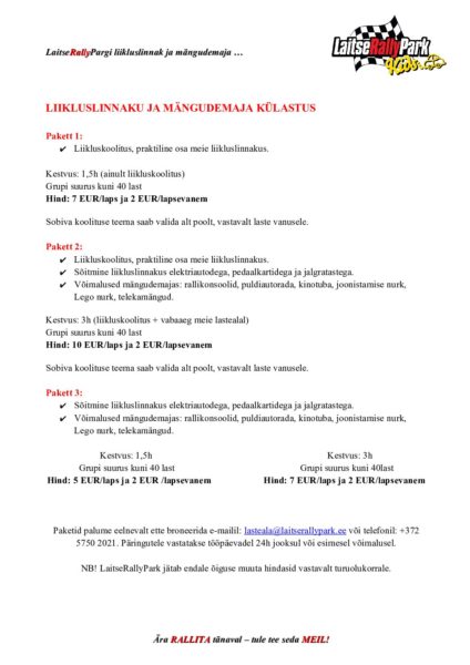 Personaalse pakkumise saamiseks võtke ühendust tel.: (+372) 671 6067 või info@laitserallypark.ee